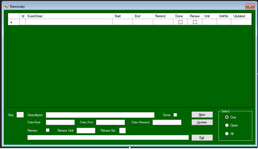 using System; using System.Collections.Generic; using System.Linq; using System.Windows.Forms; using ReminderData; using System.Configuration; namespace MemoryAssistant { public partial class Form1 : Form { //ListenumUnits = new List () { "Months", "Years" }; //string ConnectionString = @"Provider=SQLNCLI11;Data Source = DESKTOP - 0J5PE19\SQLEXPRESS;Integrated Security = SSPI; Initial Catalog = Reminders"; //string ConnectionString = @"Server=DESKTOP-0J5PE19\SQLEXPRESS;Database=Reminders;Trusted_Connection=True"; string ConnectionString = ConfigurationManager.AppSettings["connString"]; public Form1() { InitializeComponent(); } private void Form1_Load(object sender, EventArgs e) { // TODO: This line of code loads data into the 'dataSet1.Events' table. You can move, or remove it, as needed. //this.eventsTableAdapter.Fill(this.dataSet1.Events); List Events = new List (); Reminder rem = new Reminder(); Events = rem.DueEvents(ConnectionString); dataGridView1.DataSource = Events; HideFields(); } private void dataGridView1_CellClick(object sender, DataGridViewCellEventArgs e) { txtKey.Text = dataGridView1.Rows[e.RowIndex].Cells[0].Value.ToString(); txtDescription.Text = dataGridView1.Rows[e.RowIndex].Cells[1].Value.ToString(); string[] dateParts = dataGridView1.Rows[e.RowIndex].Cells[2].Value.ToString().Split(' '); txtDateStart.Text = dateParts[0]; dateParts = dataGridView1.Rows[e.RowIndex].Cells[3].Value.ToString().Split(' '); txtDateEnd.Text = dateParts[0]; dateParts = dataGridView1.Rows[e.RowIndex].Cells[4].Value.ToString().Split(' '); txtDateRemind.Text = dateParts[0]; chkDone.Checked = bool.Parse(dataGridView1.Rows[e.RowIndex].Cells[5].Value.ToString()); chkRenew.Checked = bool.Parse(dataGridView1.Rows[e.RowIndex].Cells[6].Value.ToString()); txtRenewUnit.Text = dataGridView1.Rows[e.RowIndex].Cells[7].Value.ToString(); txtRenewNo.Text = dataGridView1.Rows[e.RowIndex].Cells[8].Value.ToString(); btnUpdate.Text = "Update"; ShowFields(); } private void btnNew_Click(object sender, EventArgs e) { ClearData(); btnUpdate.Text = "Save"; ShowFields(); } private void ClearData() { txtKey.Text = ""; txtDescription.Text = ""; txtDateStart.Text = ""; txtDateEnd.Text = ""; txtDateRemind.Text = ""; chkDone.Checked = false; chkRenew.Checked = false; txtRenewUnit.Text = ""; txtRenewNo.Text = ""; } private void btnUpdate_Click(object sender, EventArgs e) { List sqlData = new List (); sqlData.Add(txtKey.Text); sqlData.Add(txtDescription.Text); string[] dateParts = txtDateStart.Text.Split('/'); sqlData.Add(dateParts[2] + "-" + dateParts[1] + "-" + dateParts[0]); dateParts = txtDateEnd.Text.Split('/'); sqlData.Add(dateParts[2] + "-" + dateParts[1] + "-" + dateParts[0]); dateParts = txtDateRemind.Text.Split('/'); sqlData.Add(dateParts[2] + "-" + dateParts[1] + "-" + dateParts[0]); sqlData.Add(chkDone.Checked.ToString()); sqlData.Add(chkRenew.Checked.ToString()); sqlData.Add(txtRenewUnit.Text); sqlData.Add(txtRenewNo.Text); Reminder rem = new Reminder(); if (btnUpdate.Text == "Save") { txtError.Text = rem.InsertSqlData(ConnectionString, sqlData); } else { List renewSqlData = new List (); if (chkRenew.Checked == true && chkDone.Checked == true) { renewSqlData = sqlData.ToList(); if (txtRenewUnit.Text == "Months") { renewSqlData[2] = DateTime.Parse(sqlData[2]).AddMonths(Int32.Parse(sqlData[8])).ToString("yyyy-MM-dd"); renewSqlData[3] = DateTime.Parse(sqlData[3]).AddMonths(Int32.Parse(sqlData[8])).ToString("yyyy-MM-dd"); renewSqlData[4] = DateTime.Parse(sqlData[4]).AddMonths(Int32.Parse(sqlData[8])).ToString("yyyy-MM-dd"); renewSqlData[5] = "0"; } else if (txtRenewUnit.Text == "Years") { renewSqlData[2] = DateTime.Parse(sqlData[2]).AddYears(Int32.Parse(sqlData[8])).ToString("yyyy-MM-dd"); renewSqlData[3] = DateTime.Parse(sqlData[3]).AddYears(Int32.Parse(sqlData[8])).ToString("yyyy-MM-dd"); renewSqlData[4] = DateTime.Parse(sqlData[4]).AddYears(Int32.Parse(sqlData[8])).ToString("yyyy-MM-dd"); renewSqlData[5] = "0"; } } txtError.Text = rem.UpdateSqlData(ConnectionString, sqlData, renewSqlData); } UpdateDataGrid(); ClearData(); btnUpdate.Text = "Update"; HideFields(); } private void btnExit_Click(object sender, EventArgs e) { Application.Exit(); } private void btnSelect_Click(object sender, EventArgs e) { UpdateDataGrid(); } private void UpdateDataGrid() { Reminder rem = new Reminder(); if (rdoAll.Checked == true) { List Events = new List (); Events = rem.AllEvents(ConnectionString); dataGridView1.DataSource = Events; } else if (rdoOpen.Checked == true) { List Events = new List (); Events = rem.OpenEvents(ConnectionString); dataGridView1.DataSource = Events; } else { List Events = new List (); Events = rem.DueEvents(ConnectionString); dataGridView1.DataSource = Events; } } private void rdoOpen_CheckedChanged(object sender, EventArgs e) { Reminder rem = new Reminder(); if (rdoOpen.Checked == true) { List Events = new List (); Events = rem.OpenEvents(ConnectionString); dataGridView1.DataSource = Events; } } private void rdoDue_CheckedChanged(object sender, EventArgs e) { if (rdoDue.Checked == true) { Reminder rem = new Reminder(); List Events = new List (); Events = rem.DueEvents(ConnectionString); dataGridView1.DataSource = Events; } } private void rdoAll_CheckedChanged(object sender, EventArgs e) { if (rdoAll.Checked == true) { Reminder rem = new Reminder(); List Events = new List (); Events = rem.AllEvents(ConnectionString); dataGridView1.DataSource = Events; } } private void HideFields() { lblKey.Visible = false; lblDescription.Visible = false; lblDone.Visible = false; lblDateStart.Visible = false; lblDateEnd.Visible = false; lblDateRemind.Visible = false; lblRenew.Visible = false; lblRenewUnit.Visible = false; lblRenewNo.Visible = false; txtKey.Visible = false; txtDescription.Visible = false; chkDone.Visible = false; txtDateStart.Visible = false; txtDateEnd.Visible = false; txtDateRemind.Visible = false; chkRenew.Visible = false; txtRenewUnit.Visible = false; txtRenewNo.Visible = false; txtError.Visible = false; btnUp