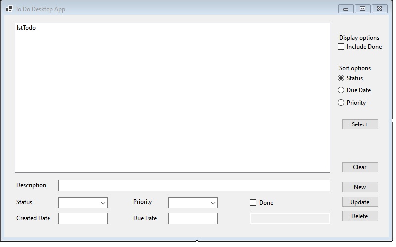 using System; using System.Collections.Generic; using System.Windows.Forms; using ToDoDesktop.Model; using ToDoDesktop.DataAccess; using System.Text.Json; using MongoDB.Bson; using System.Globalization; namespace ToDoDesktop { public partial class Form1 : Form { Listtodos = new List (); List ids = new List (); public Form1() { InitializeComponent(); } private void btnNew_Click(object sender, EventArgs e) { if (validateInput()) { todo td = new todo(); td.Description = txtDescription.Text; td.Status = cboStatus.Text; td.Priority = cboPriority.Text; td.Created_Date = txtCreated.Text; td.Due_Date = txtDue.Text; td.Done = chkDone.Checked; string strTodo = JsonSerializer.Serialize(td); //MessageBox.Show(strTodo); Write dw = new Write(); if (!dw.InsertData(strTodo)) { MessageBox.Show("Error in writing data"); } RefreshData(); } } private bool validateInput() { try { bool vStatus = true; DateTime vDate; if (txtDescription.Text == "") { MessageBox.Show("Description is a mandatory field"); vStatus = false; } if (!cboStatus.Items.Contains(cboStatus.Text)) { MessageBox.Show("Invalid Status"); vStatus = false; } if (!cboPriority.Items.Contains(cboPriority.Text)) { MessageBox.Show("Invalid Priority"); vStatus = false; } if (txtCreated.Text != "") { txtCreated.Text = DateTime.Parse(txtCreated.Text).ToString("yyyy-MM-dd", CultureInfo.InvariantCulture); if (txtCreated.Text == "") { MessageBox.Show("Invalid Created Date"); vStatus = false; } } else { txtCreated.Text = DateTime.Now.ToString("yyyy-MM-dd", CultureInfo.InvariantCulture); } if (txtDue.Text != "") { txtDue.Text = DateTime.Parse(txtDue.Text).ToString("yyyy-MM-dd", CultureInfo.InvariantCulture); if (txtDue.Text == "") { MessageBox.Show("Invalid Due Date"); vStatus = false; } } else { MessageBox.Show("Missing Due Date"); vStatus = false; } return vStatus; } catch (Exception ex) { MessageBox.Show(ex.Message.ToString()); return false; } } private void Form1_Load(object sender, EventArgs e) { SelectData(); } private void btnUpdate_Click(object sender, EventArgs e) { if (validateInput()) { todo td = new todo(); td._id = txtId.Text; td.Description = txtDescription.Text; td.Status = cboStatus.Text; td.Priority = cboPriority.Text; td.Created_Date = txtCreated.Text; td.Due_Date = txtDue.Text; td.Done = chkDone.Checked; string strTodo = JsonSerializer.Serialize(td); //MessageBox.Show(strTodo); Update du = new Update(); if (!du.UpdateData(td)) { MessageBox.Show("Error in updating data"); } RefreshData(); } } private void btnDelete_Click(object sender, EventArgs e) { if (txtId.Text != "") { Delete dd = new Delete(); dd.DeleteData(txtId.Text); RefreshData(); } } private void btnSelect_Click(object sender, EventArgs e) { SelectData(); } private void lstTodo_SelectedIndexChanged(object sender, EventArgs e) { //MessageBox.Show(lstTodo.SelectedItem.ToString()); Read dr = new Read(); //string id = ids<> int intItem = lstTodo.SelectedIndex; if (intItem != -1) { todo rdb = new todo(); BsonDocument bd = new BsonDocument(); bd = dr.ReadData(ids[intItem]); if (bd != null) { txtId.Text = bd.GetValue("_id").ToString(); txtDescription.Text = bd.GetValue("Description").ToString(); cboStatus.Text = bd.GetValue("Status").ToString(); cboPriority.Text = bd.GetValue("Priority").ToString(); txtCreated.Text = bd.GetValue("Created_Date").ToString(); txtDue.Text = bd.GetValue("Due_Date").ToString(); chkDone.Checked = bd.GetValue("Done").ToBoolean(); Application.DoEvents(); } //string[] arr = lstTodo.SelectedItem.ToString().Split('\t'); //txtId.Text = arr[0]; //txtDescription.Text = arr[1]; //Application.DoEvents(); btnNew.Visible = false; btnUpdate.Visible = true; btnDelete.Visible = true; } else { MessageBox.Show("Unable to find record for selection"); } } private void lstTodo_Click(object sender, EventArgs e) { //MessageBox.Show(sender.) } private void btnClear_Click(object sender, EventArgs e) { ClearData(); } private void ClearData() { txtId.Text = ""; txtDescription.Text = ""; cboStatus.Text = ""; cboPriority.Text = ""; txtCreated.Text = ""; txtDue.Text = ""; chkDone.Checked = false; Application.DoEvents(); btnNew.Visible = true; btnUpdate.Visible = false; btnDelete.Visible = false; } private void SelectData() { Read dr = new Read(); List docs = new List (); string strSort; if (radStatus.Checked) { strSort = "Status"; } else { if (radDue.Checked) { strSort = "Due_Date"; } else { strSort = "Priority"; } } docs = dr.SelectData(chkDisplayDone.Checked, strSort); lstTodo.Items.Clear(); ids.Clear(); todo td = new todo(); string SortData; foreach (BsonDocument doc in docs) { ids.Add(doc.GetValue("_id").ToString()); //if (strSort == "Status") //{ // SortData = doc.GetValue("Status").ToString(); //} //else if (strSort == "Due_Date") //{ // SortData = doc.GetValue("Due_Date").ToString(); //} //else //{ // SortData = doc.GetValue("Priority").ToString(); //} SortData = doc.GetValue(strSort).ToString(); lstTodo.Items.Add(SortData + '\t' + doc.GetValue("Description").ToString()); //MessageBox.Show("Also clear the data from the text fields below. Create functions for this and others."); } } private void RefreshData() { ClearData(); SelectData(); } } } using System; using System.Collections.Generic; using System.Linq; using System.Text; using System.Threading.Tasks; namespace ToDoDesktop.Model { public class todo { public string? _id { get; set; } public string? Description { get; set; } public string? Status { get; set; } public string? Priority { get; set; } public string? Created_Date { get; set; } public string? Due_Date { get; set; } public bool? Done { get; set; } } } using System; using System.Collections.Generic; using System.Linq; using System.Text; using System.Threading.Tasks; using MongoDB.Driver; using MongoDB.Bson; namespace ToDoDesktop.DataAccess { internal class Delete { public bool DeleteData(string jsonData) { var settings = MongoClientSettings.FromConnectionString( "mongodb+srv://theSkinner:NortholtMartin14113609@cluster0.mtpjo.mongodb.net/" + "myDatabase?retryWrites=true&w